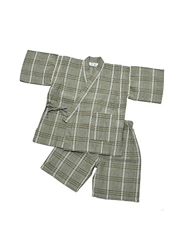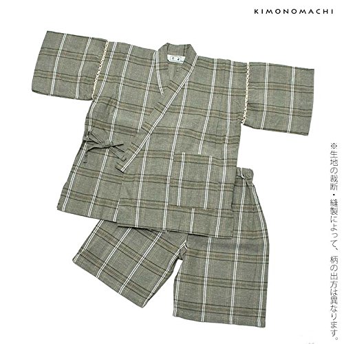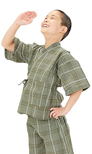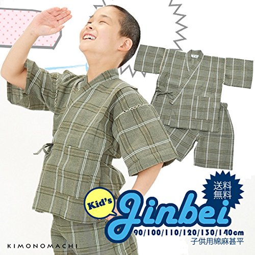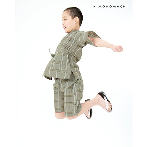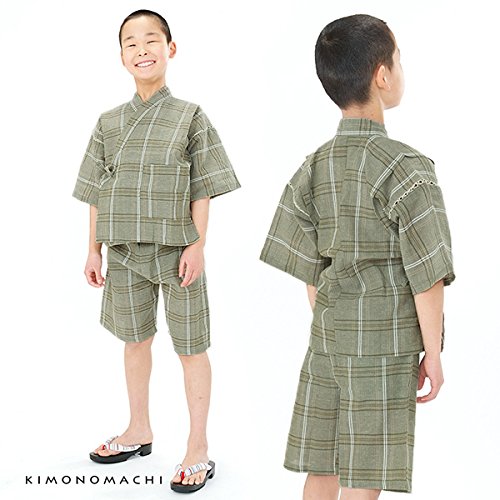 [ 京都きもの町 ] 男の子 じんべい グリーン格子縞 140cm