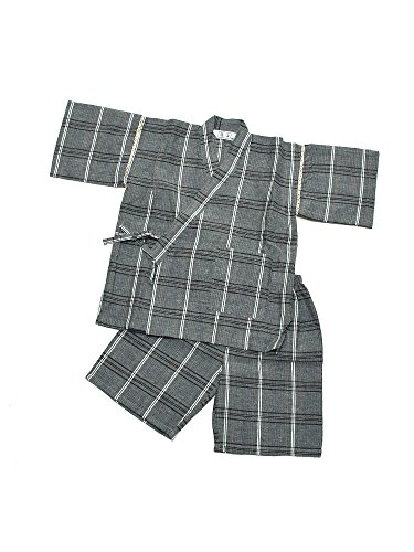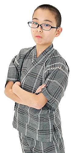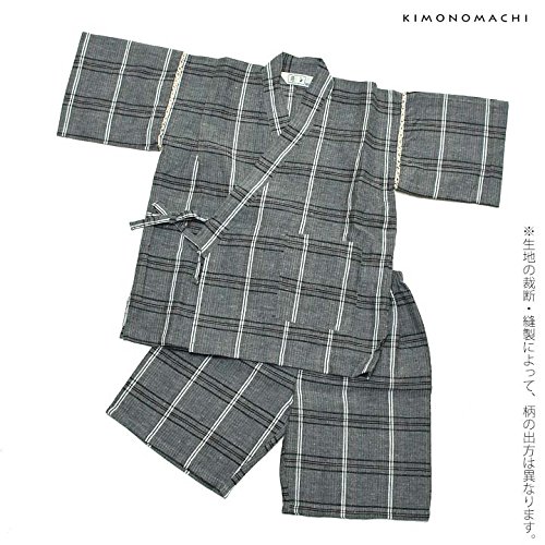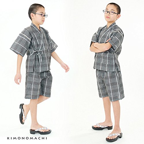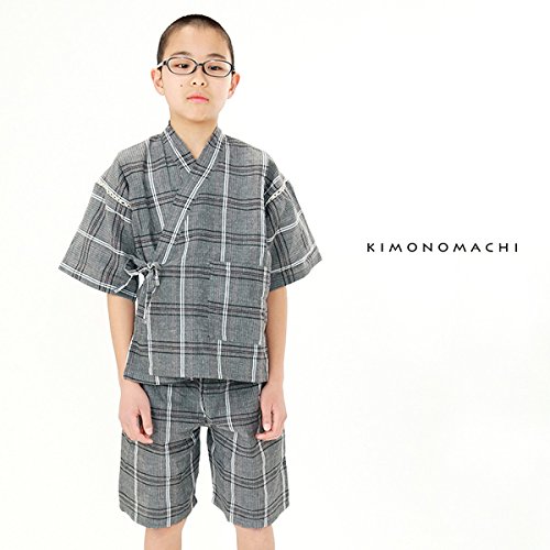 [ 京都きもの町 ] 男の子 じんべい グレー格子縞 130cm