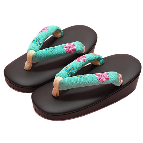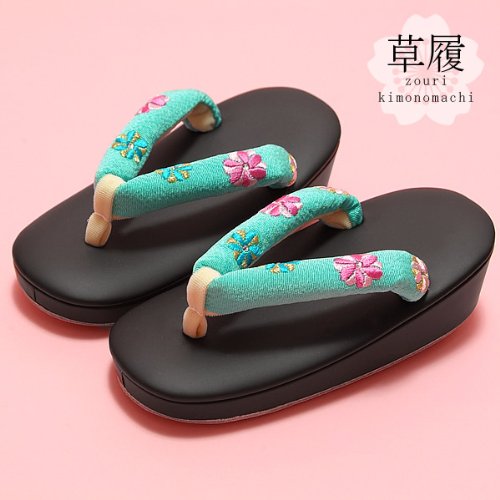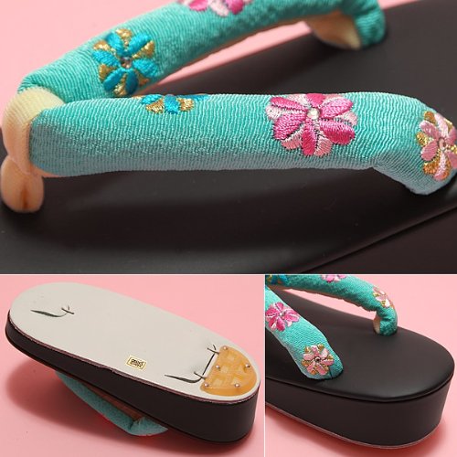 台は光沢のないつや消しのマットな黒色、鼻緒は少し緑みの水色地に、濃いピンク、淡いピンク、濃い水色、ゴールドなどの刺繍の花模様。