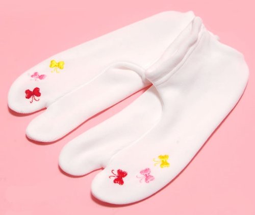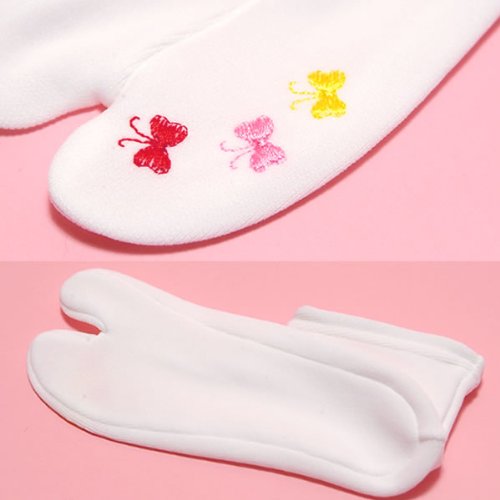 白足袋に、赤、ピンク、黄色の蝶々の刺繍。