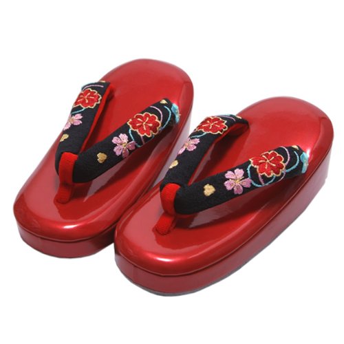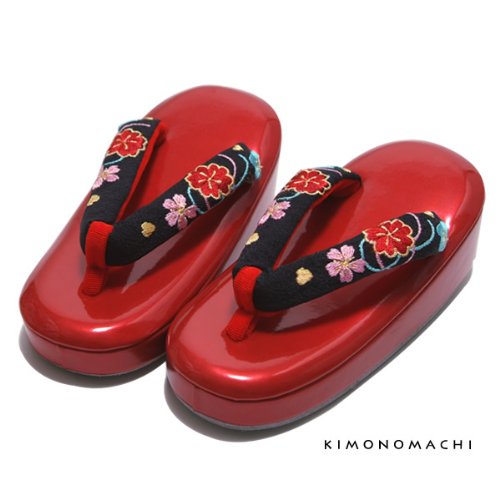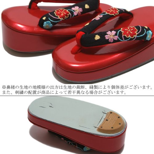 鼻緒は黒色地にピンク、水色、赤色、淡い黄色の色合いの桜、小梅などの刺繍。台は上品な光沢の濃いめの赤紅色。