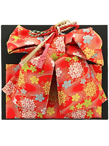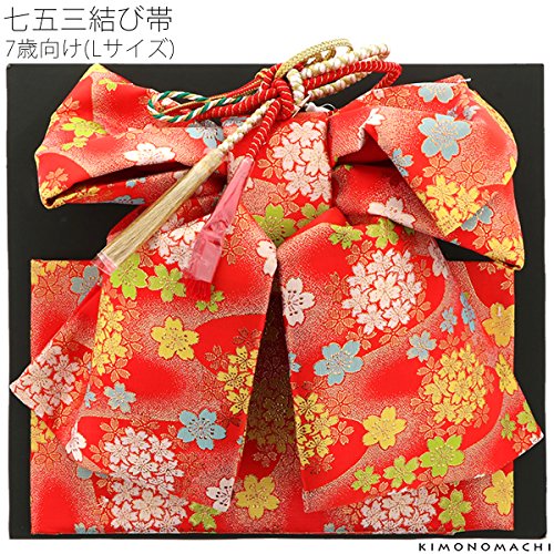 [ 京都きもの町 ] 7歳の女の子向け 結び帯 朱赤色 流水に桜 七五三 二部式帯 付け帯 日本製 Lサイズ