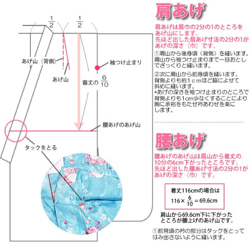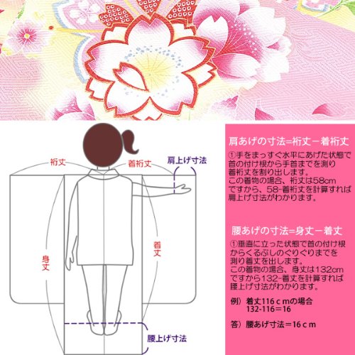 ※こちらの商品は着物、襦袢とも肩あげ、腰あげがされていない状態でのお届けとなります。お子様のご身長にあわせて肩あげ、腰あげをなさってください。ただし、美容室などに持ち込まれプロの着付け師さんが着付けてくださるようであれば腰あげはとくにしていなくても大丈夫な場合がございます。着付けの際の調節で綺麗に着れる場合が多くありますので一度前もってご確認されるのが良いかと思います。