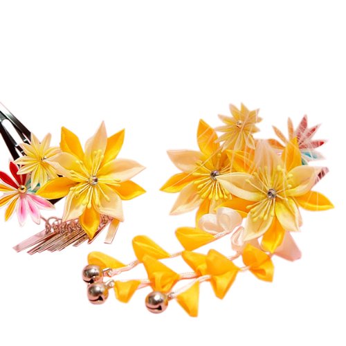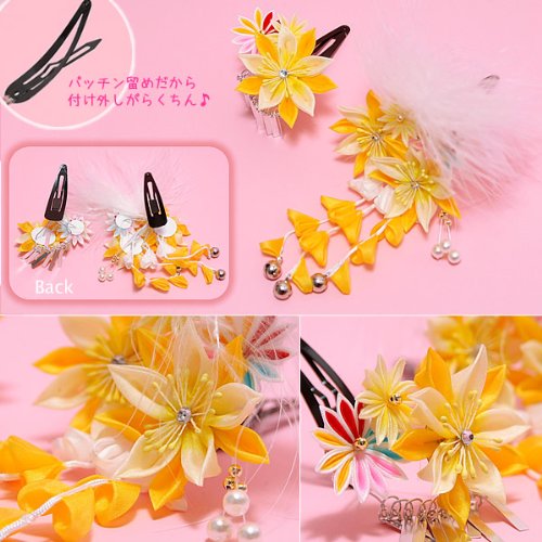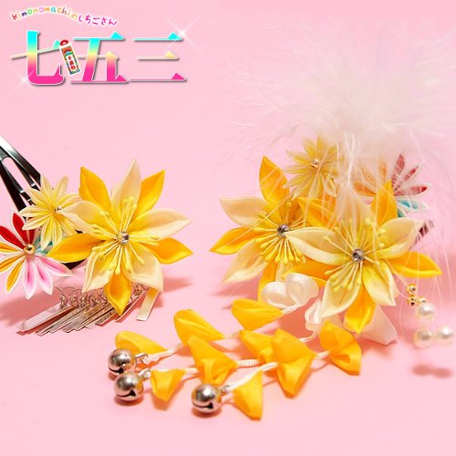 [ 京都きもの町 ] 子供用 髪飾り セット 黄色×生成り つまみ細工 の 花 髪飾り ふわふわ羽根飾り付き
