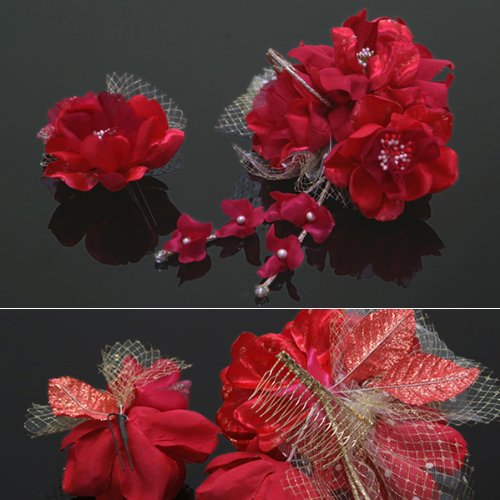 鮮やかな赤色、少しくすんだような暗めの赤色のお花。ところどころにゴールドのラメ感。ゴールドのレース。大きめの髪飾りにはゴールドの紐飾り、わずかにピンクみを含んだ赤色の花びらのついた下がり飾りがついています。