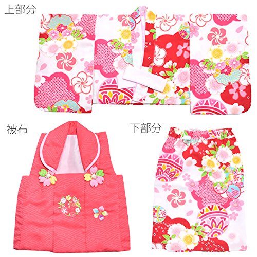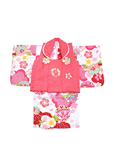 [京都きもの町] ベビー 着物セット 白色にピンク、赤色ぼかしの着物、濃いピンク色の被布コート 女の子 こども
