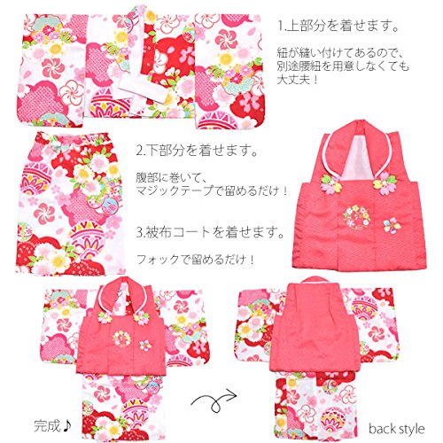 - 【カラー】着物は白色地に、赤、ピンクのぼかし、桜、捻じ梅などの模様。被布は濃いピンク色地で表には刺繍が入っています。