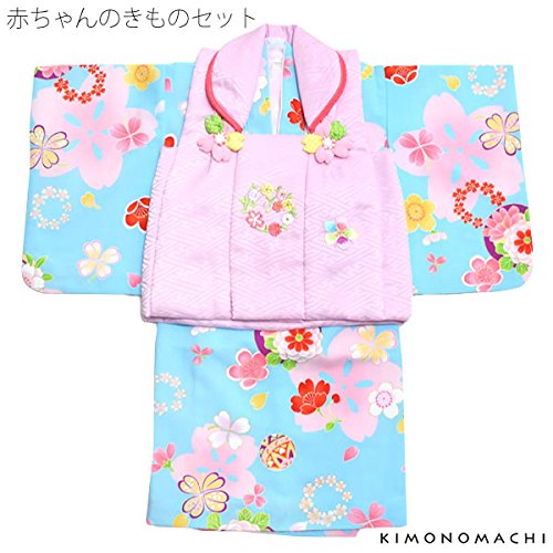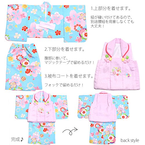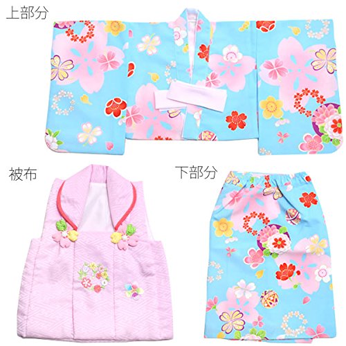 [ 京都きもの町 ] ベビー 着物セット 水色の着物 薄いピンク色の被布コート 女の子 こども