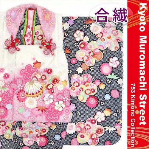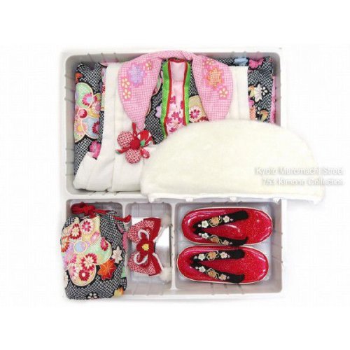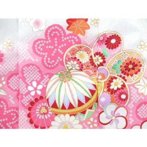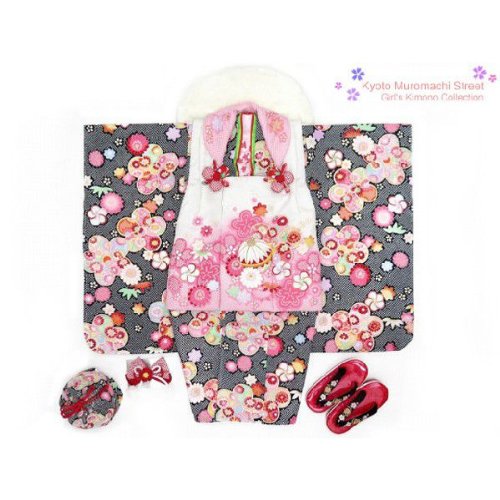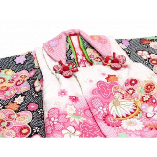 七五三 着物 3歳女の子合繊着物フルセット「白桃&黒、鞠と古典桜」KFR1305