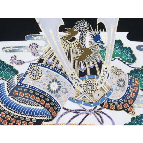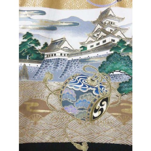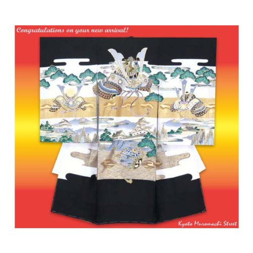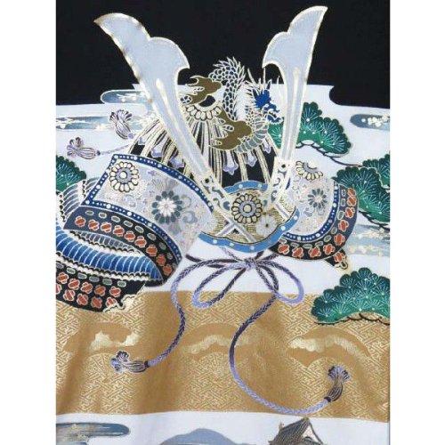 お宮参り 着物 正絹の男の子の着物(初着・産着)「黒地、兜と城・小槌」MSK09