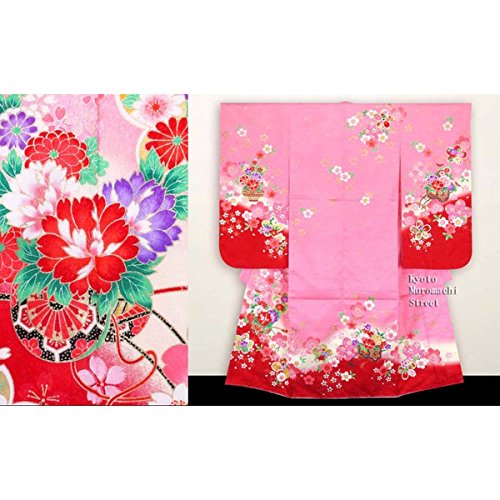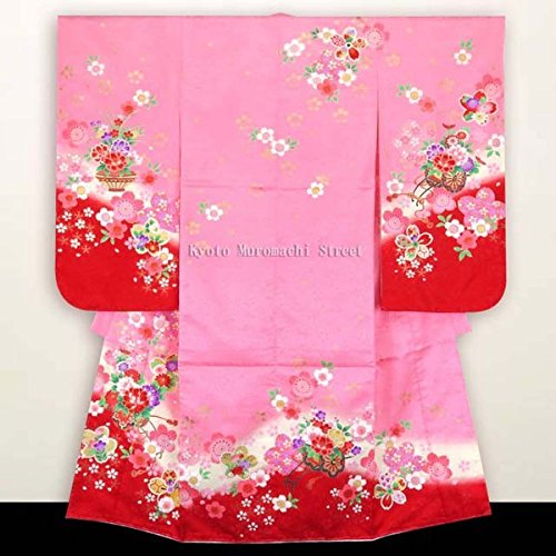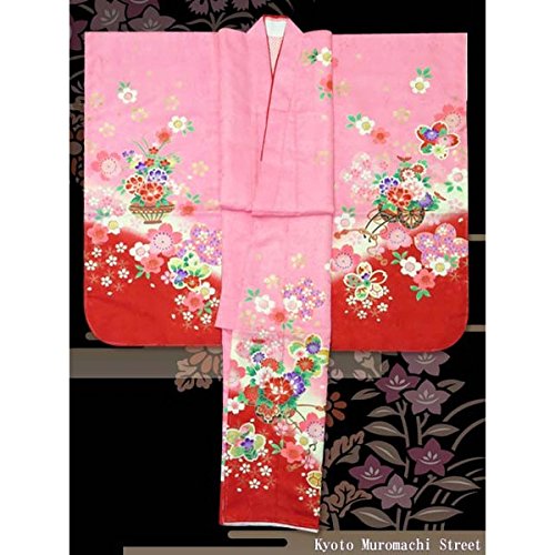 七五三 着物 7歳女の子 絵羽柄四つ身の着物(合繊)「桃、花車」STK665