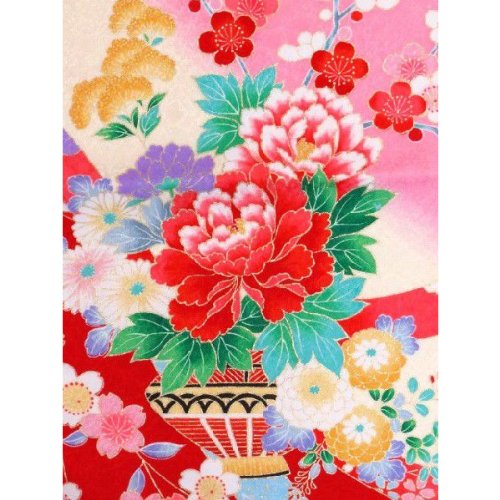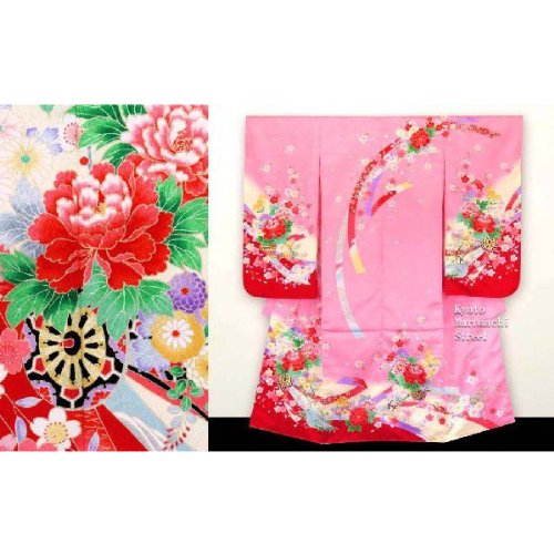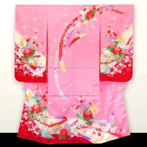 七五三 着物 7歳女の子 絵羽柄四つ身の着物(合繊)「 桃、花車に岩」STK677