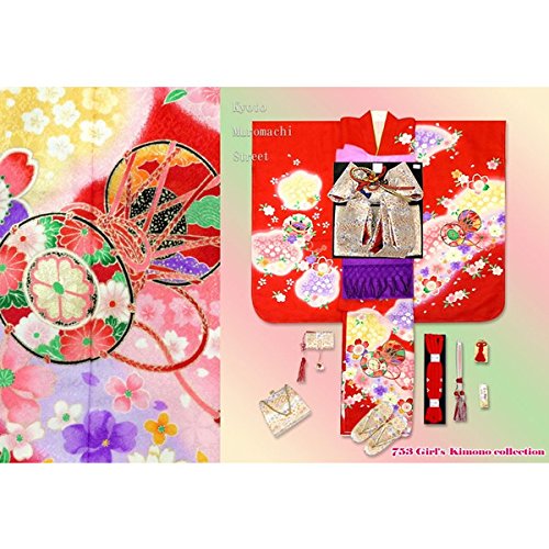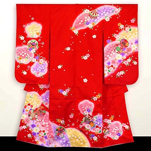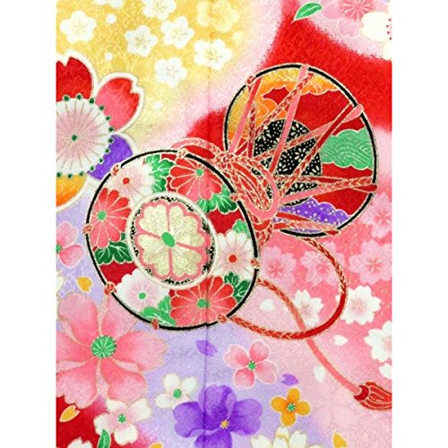 七五三 お正月に 7歳女の子 絵羽柄の子供着物フルセット(合繊)「赤、鼓と桜」STK674rWWPM