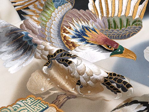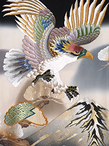 - 背中の鷹の柄は刺繍で描かれており、金彩や刺繍を随所にあしらった高級感のあるお着物です。