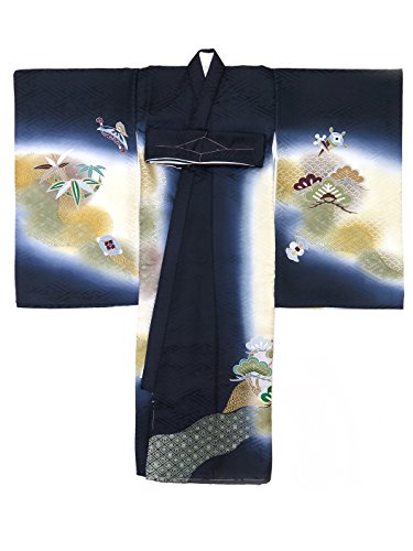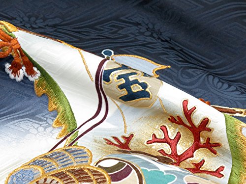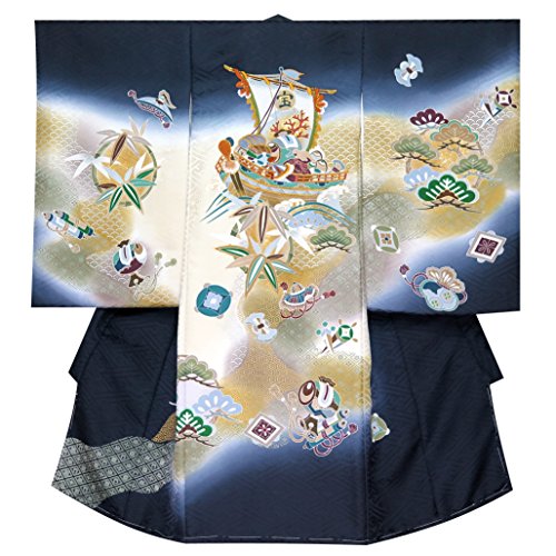 産着 男の子 お宮参りの着物 刺繍入りの熨斗目 (正絹)「紺 宝船と笹に松」HBU828
