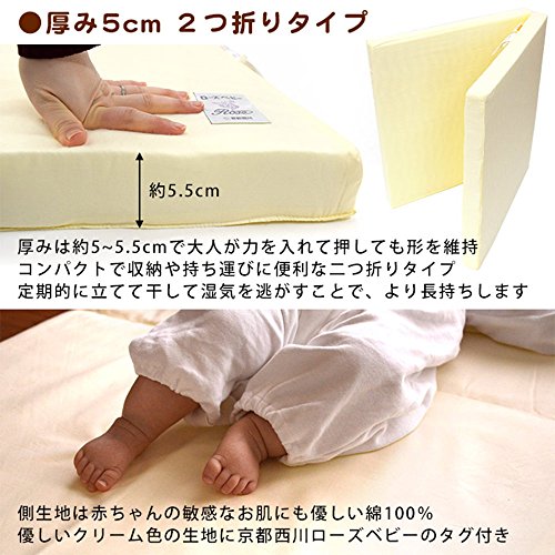 ・厚みは約5~5.5cm。持ち運びやお手入れが簡単な2つ折りタイプ。側生地は赤ちゃんのお肌に優しい天然素材綿100%です。