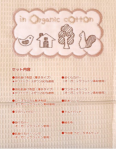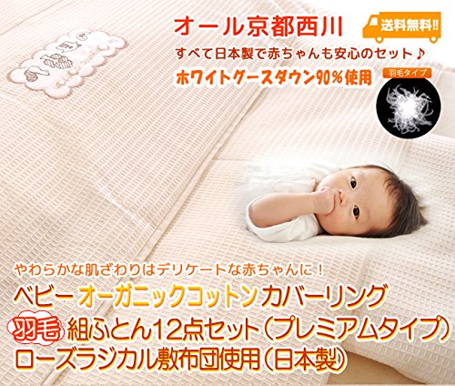 京都西川 ベビーオーガニックコットンカバーリング 羽毛組ふとん12点セット(プレミアムタイプ)(ローズラジカル敷布団使用)(日本製)ホワイトグースダウン90%使用