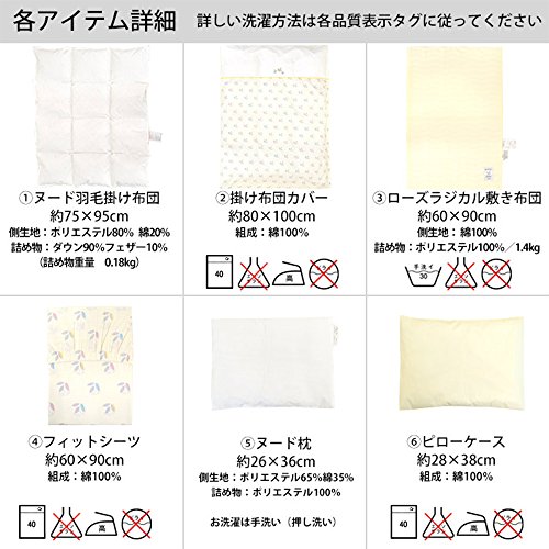 - ■4.フィットシーツ 約60×90cm 組成:綿100% 重量:約135g 洗濯機洗い ■5.ヌード枕 約26×36cm 側生地:ポリエステル65%綿35% 詰め物:ポリエステル100% 重量:約50g 手洗い