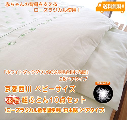 京都西川 ベビーサイズ 羽毛組ふとん10点セット (ローズラジカル敷布団使用)(日本製) (ペアタイプ)ホワイトダウン90%使用 グリーン色