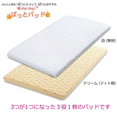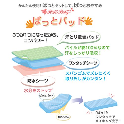 かんたん便利!3つが1つになった3役1枚のパッドです。 ◆1.汗取り敷きパッド:綿100%パイルで赤ちゃんの汗をしっかり吸収します。 ◆2.ワンタッチシーツ:スパンゴムでずれにくく取外しがカンタン♪ 3.防水シーツ:おねしょやミルクの吐き戻しなどの水分を敷きふとんに通さない防水仕様。 敷きふとんの上に「ぱっ」とワンタッチでメイキングが完了します。