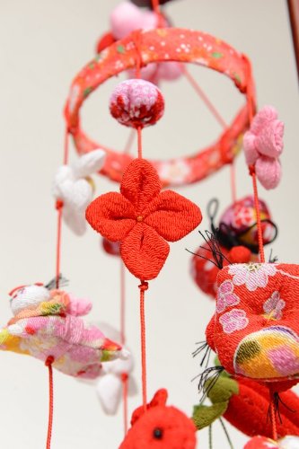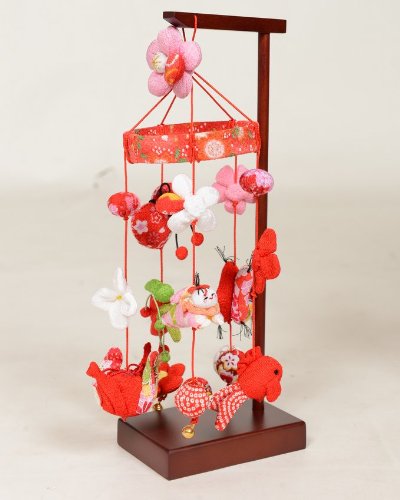 桃の花は花のように可愛いく育つようにという願いをこめて、鶴は長生きをするように、他にもおめでたい金魚等15種類の縁起物をつるしました。