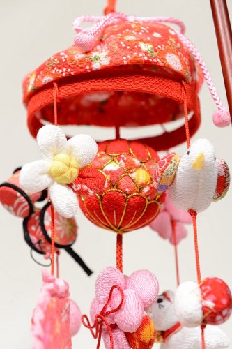 - 『卓上傘付ひなもも吊るし』縮緬傘付真ん中に手毬「性格が丸く育つよう」と花「花のように美しく可憐に育つよう」と願いを込め。