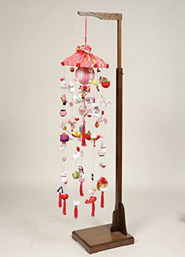 傘付うさぎの雛まつりつるし飾 古くから兎は力強く跳ねるジャンプ力で魔を跳ね除け長い耳は福を集めることから、縁起の良い動物とされています。また、兎は跳躍し後ずさりをしないので縁起が良く、成人式の着物の柄にも多く用いられています。 昔の遊び道具、でんでん太鼓・羽子板・風車等早く大きくなって元気に遊べるよう願いを込めつるしました。 季節感いっぱいの兔の雛つるし飾りはお部屋のインテリアにも大好評を得ています。 スタンド高さ: 120~190cm(調整可能)