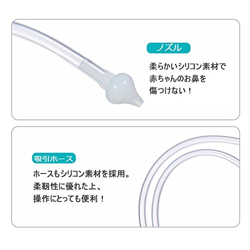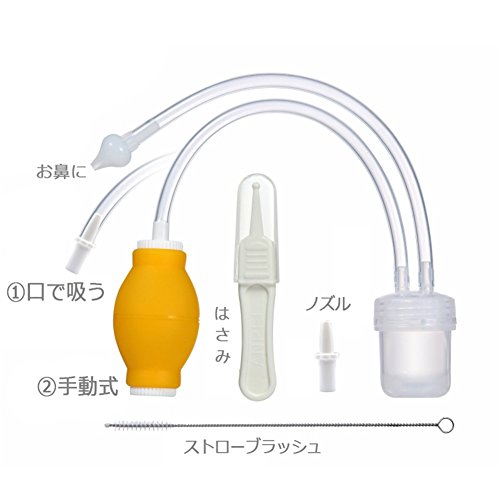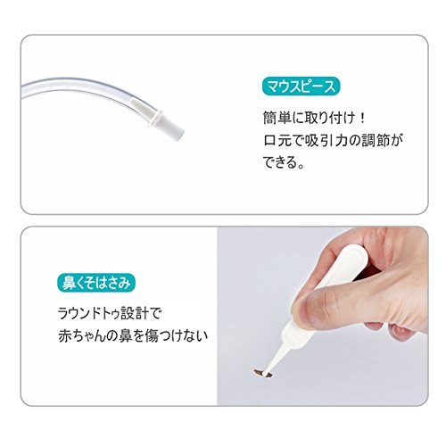 - ●パッケージ:吸い口、ノズル、鼻水たまり容器、ホース、手動式の吸引器、逆流防止パーツ、鼻くそハサミ、ブラッシュ