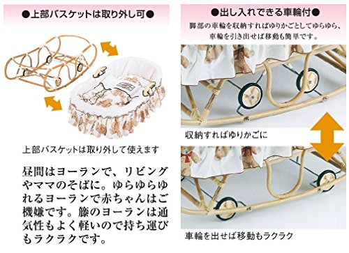 ●サイズ幅95X奥行54X高さ47㎝ 重量 5kg ●素材・フレーム:籐、ウレタン樹脂塗装・フトン:【生地】綿100%【中綿】ポリエステル100%(布団セット内容:掛・敷フトン・枕・フリル付) ●備考・かご底面内寸:76.5x37cm・布団サイズ:・【掛布団】幅52×奥行67㎝・【敷布団】幅44×奥行74㎝・【枕】幅30×奥行16㎝ ・梱包サイズ:幅97×奥行56×高さ49㎝ 重量 6kg