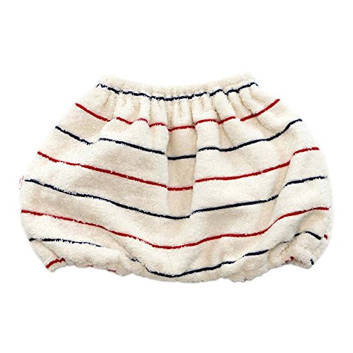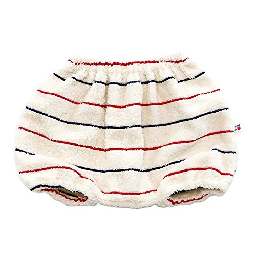 オーガニックコットンのタオル地をベースに、レッドとネイビーのストライプが入った、トリコロールカラーのかわいいベビーパンツ(おむつカバー)です。出産祝いにオススメです!