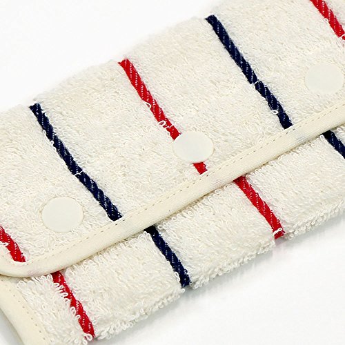 - オーガニックコットンのタオル地をベースに、レッドとネイビーのストライプが入った、トリコロールカラーの便利なサッキングパッド(抱っこひも用よだれカバー)。出産祝いにオススメです!