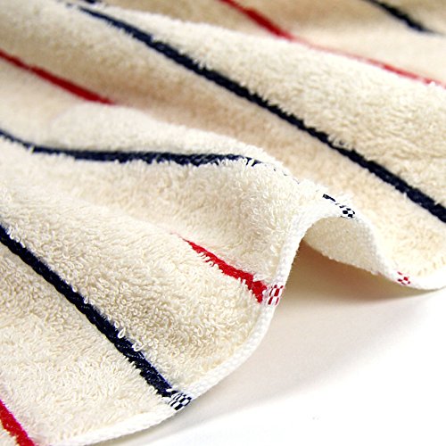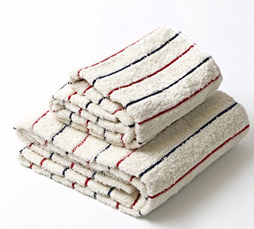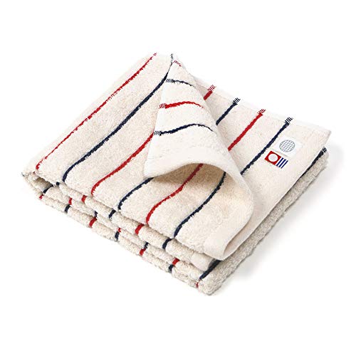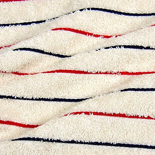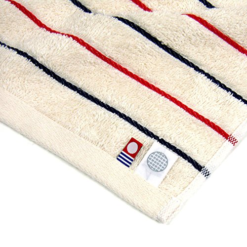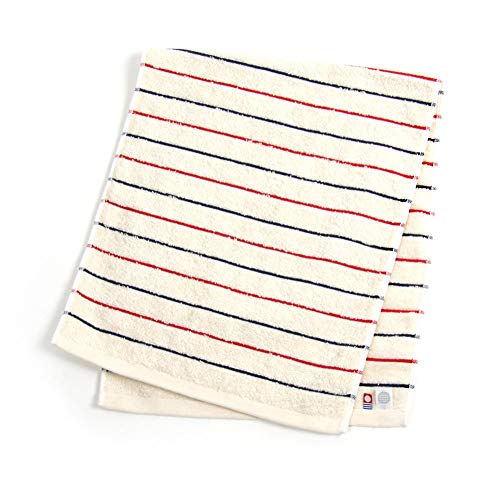 - オーガニックコットンのタオル地をベースに、レッドとネイビーのストライプが入った、トリコロールカラーが特徴です。