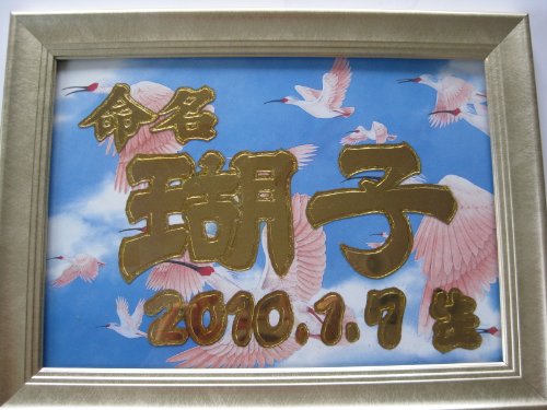 お子さんやお孫さんのお名前を金箔を使って描き、A4サイズの額縁にお入れ致します。 書体、背景、額縁等ご相談下さい。 ご相談はメールにお客様のご連絡先を載せて頂ければこちらからお電話させて頂きます。 製作には3,4週間かかります。