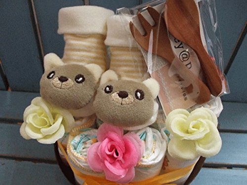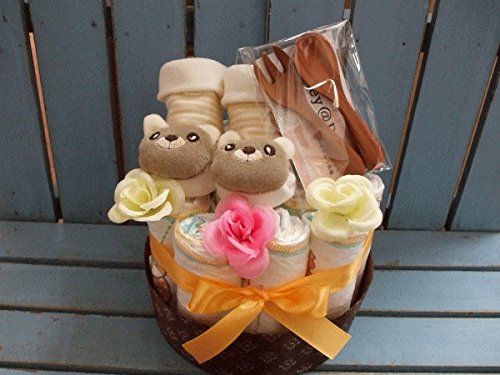 - ベビーソックスと木のスプーン&フォークをデコレーションしたギフトです。