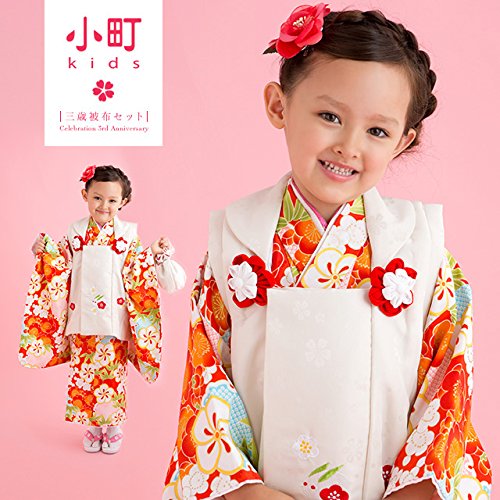 三歳被布着物セット 小町kids 白被布×橙色着物 竹梅 雪輪 花