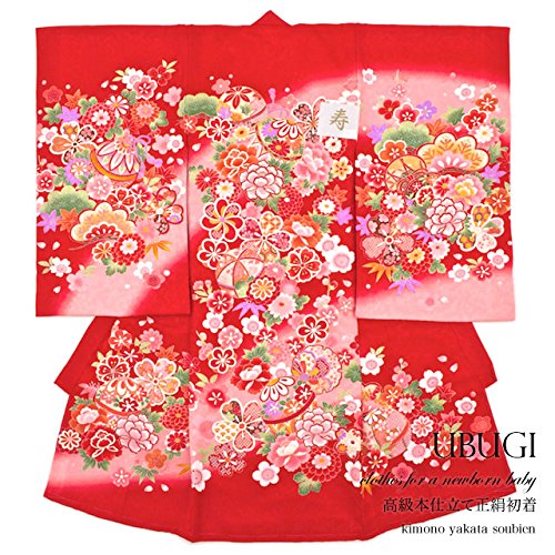 赤ちゃんのお宮参りを素敵に彩る、正絹の高級初着(産着)です。鞠や牡丹、小紋柄のねじり梅などの花柄が施されています。表地は、鮮やかな色みと、ふわりとした肌触りが魅力の絹100%です。胴裏と下着地はポリエステル素材で、お手入れがしやすく衛生的です。こちらは仕立て上がりですので、お届け後すぐにお召しいただけます。