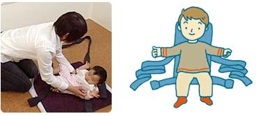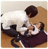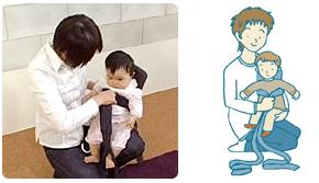 ![]() | 2. 赤ちゃんの脇の下にひもを通し、胸の前でぎゅっとしめて握る。このとき、赤ちゃんとひもの間に隙間をつくらないこと。 |