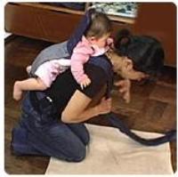 ![]() | 肩ひもを胸のまえで交差したあと、初めての方はひもを膝の間にはさむとよい。こうするとおんぶひもが安定し、ひもを片方ずつDカンに通す間に全体がずれたりせず安心。 |