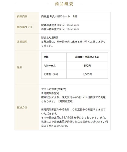 - 【商品内容】 内容量:お食い初めセット 1個 【梱包箱サイズ】 祝鯛の姿焼き:385×180×70mm お食い初め重:283×133×73mm 【賞味期限】 製造より2週間 ※解凍後は、その日の内に出来るだけ早くお召し上がりください。