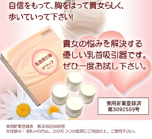 陥没乳首に密かに悩んでいませんか?普段着の下につけても目立たない、小さな吸引器が優しく乳首を吸出し、ケアします。 もう悩まないで。 貴女らしく胸を張って歩いていって欲しい、そんな願いでつくりました。 「ピペトップ」は、小型なので装着したままブラジャーをしたり、服を着たり、日常生活や仕事ができるバストケア用品です。 乳頭に押し付ける事により、陰圧を発生し乳頭を吸い出します。