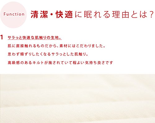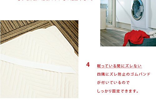 驚きの高品質 あんしんの理由 【1】サラっと快適な肌触り―高級感のあるキルトが施されていて程よい気持ち良さです。 【2】抗菌・防臭・防ダニ加工―テイジンが開発したマイティトップ2わたを使用。【3】ご家庭の洗濯機でも洗えるウォッシャブル仕様。 【4】眠っている間にズレない―四隅にズレ防止のゴムバンドが付いているのでしっかり固定できます。