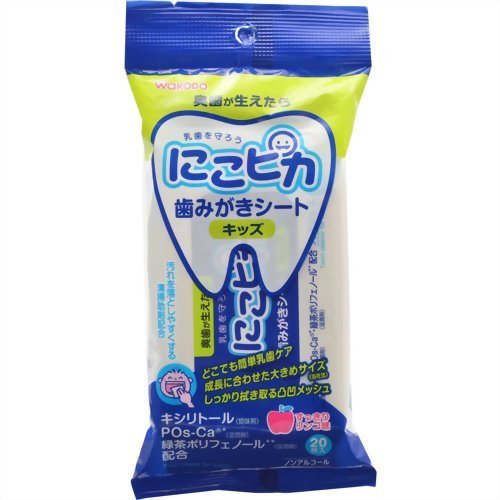 「にこピカ 歯みがきシート キッズ 20枚」は、お口の中をきれいにして口臭を予防する子供用歯磨きシートです。汚れをしっかり拭き取る凹凸メッシュシートは、お口の成長に合わせた大きめサイズとなっています。持ち運びできるので、どこでも簡単に乳歯ケアができます。汚れを落としやすくする清掃助剤を配合。すっきりりんご味。