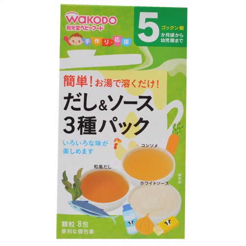 ●【商品説明】●「手作り応援 だし&ソース 3種パック 8包 5ヶ月頃から」は、離乳食作りに便利なだしとソースの詰合せです。●和風だし、コンソメ、ホワイトソースが入っています。●いろいろなメニュー作りにお使いください。●便利な個包装タイプ。●5ヶ月頃から幼児期まで。●【原材料に含まれるアレルギー物質】●乳、小麦●【つくり方】●和風だし・コンソメ・・・本品1包に対し、お湯約30ml(大さじ2杯)を加えて溶かします。●ホワイトソース・・・本品1包に対し、お湯約15ml(大さじ1杯)を加えて溶かします。●※食べやすい温度か確認してからあげてください。●(大さじは15mlの計量スプーンです。●)●【ご注意】●※着色料、保存料、香料は使用しておりません。●※デキストリンとは、でんぷんを消化吸収しやすいように分解したものです。●お湯の取り扱いにご注意ください。●袋開封後は吸湿しやすいので使いきるようにしてください。●食べ残しや作りおきはあげないでください。●月齢は目安です。●あせらずに段階的にすすめましょう。●離乳のすすめ方については、専門家にご相談くだ...