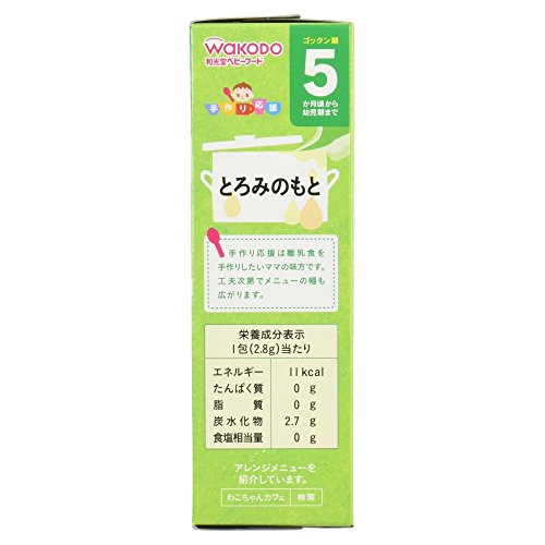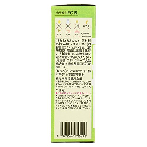 ●【商品説明】●「手作り応援 とろみのもと 8包 5ヶ月頃から」は、加熱不要、混ぜるだけでとろみがつくとろみのもとです。●外出先でも、ママの取り分けメニューに混ぜれば、すぐに食べやすい離乳食に。●便利な個包装タイプ。●5ヶ月頃から幼児期まで。●【つくり方】●人肌にさました離乳食に時々かき混ぜながら、お好みのとろみになるまで少しずつ振り入れてください。●およそ30秒でとろみがついてきます。●食べやすい温度か確認してからあげてください。●目安:ベビー用茶碗 1/3(約30-40ml)に1包。●メニューや温度、食材によって調節してください。●※一度に多量に加えたり、とろみのついたもの、温度が高いものに加えるとダマになる場合があります。●※溶かすと白くにごる場合がありますが、品質に問題はありません。●※味噌など食材によってはとろみのつきにくい場合があります。●【ご注意】●※着色料、保存料、香料は使用しておりません。●※デキストリンとは、でんぷんを消化吸収しやすいように分解したものです。●お湯の取り扱いにご注意ください。●袋開封後は吸湿しやすいので使いきるよう...