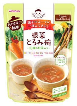 - ●「おやこdeごはん 1歳から大人もおいしい 根菜とろみ椀 300g」は、かぶのみぞれ汁を手軽に親子で楽しめる、10種類以上の野菜のうまみが溶け込んだ美味しいスープです。