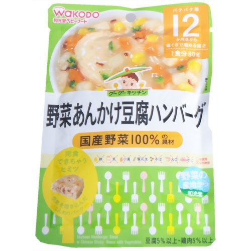 「グーグーキッチン野菜あんかけ豆腐ハンバーグ80g」は、歯ぐきで噛めるふんわりハンバーグのベビーフードです。野菜たっぷりの中華風あんかけをからめた、豆腐入りのやわらかいハンバーグ。咀嚼を考えた食べやすく、噛みやすい具材。国産野菜を使用しています。パクパク期の12か月頃から。着色料、保存料、香料は使用していません。