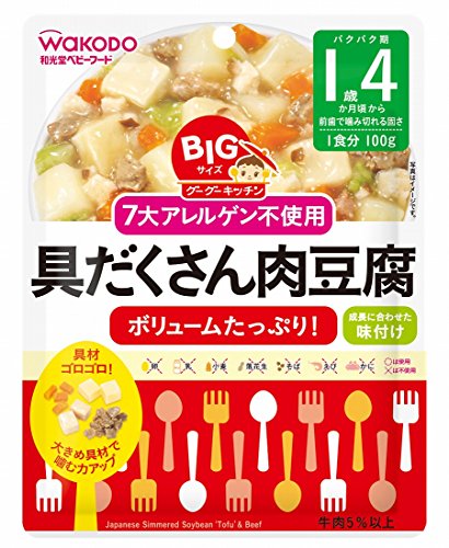 ●【商品説明】●「BIGサイズのグーグーキッチン 具だくさん肉豆腐 100g 1歳4ヶ月頃から」は、咀嚼を考えた「食べやすく」「噛みやすい」具材を使用したおかず(ベビーフード・7大アレルゲン不使用)です。●牛肉とかつおだしのうま味がしみ込んだ豆腐を、やさしい和風味に仕上げました。●国産野菜100%の具材を使用しています。●着色料・保存料・香料は使用しておりません。●牛肉5%以上。●1食分。●1歳4ヶ月頃から(前歯で噛み切れる固さ)。●【原材料に含まれるアレルギー物質】●卵、乳、小麦、落花生、そば、えび、かにの7大アレルゲン不使用。●※本品中のしょうゆは小麦を使用していません。●【お召し上がり方】●調理済みですので、そのまま召し上がれます。●温めますといっそうおいしく召し上がれます。●お湯で温める場合:袋の封を切らずにお湯の中に1-2分つけて温めてください。●袋の穴に、はしなどを差し込んで取り出します。●切り口から封をあけ、器などに移し、軽くかき混ぜてからお召し上がりください。●※火にかけて沸騰させたまま温めないでください。●電子レンジで温める場合:中...