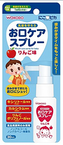 「和光堂 にこピカ お口ケアスプレー りんご味 1歳6か月頃から 30ml」は、歯みがき後やお休み前にシュッとスプレーするだけの簡単、便利なお口ケアスプレー(マウススプレー)です。キシリトール(甘味剤)・カルシウム(湿潤剤)・りんごポリフェノール(湿潤剤)配合で、お口の中を清潔に保ちます。処方液は食品用原料成分のみ使用しました。ノンアルコール、パラベン無添加、無着色。携帯に便利なスプレータイプ。りんご味。