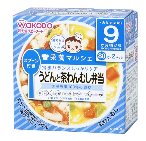 • 原材料:●たらと和野菜のうどん/うどん、野菜(にんじん、だいこん、さやいんげん)、かつお昆布だし、たら、卵黄、しょうゆ、ぶどう糖、米酢、わかめ、増粘剤(加工でん粉) ●茶わんむし/野菜(にんじん、たまねぎ、キャベツ)、卵黄、かつお昆布だし、たら、しょうゆ(小麦を含む)、砂糖、寒天、米酢、食塩、増粘剤(加工でん粉)