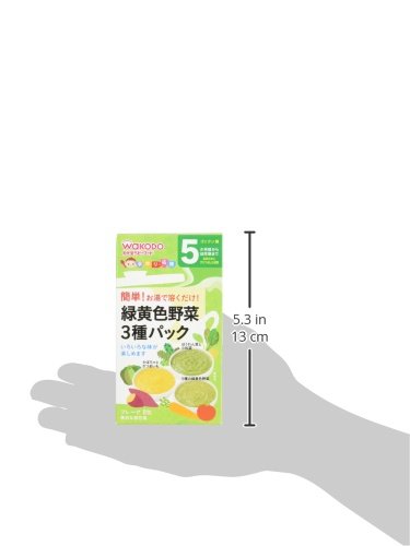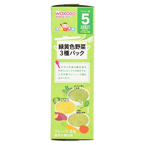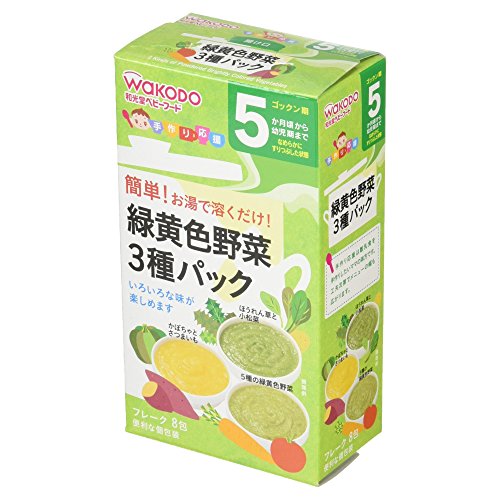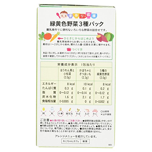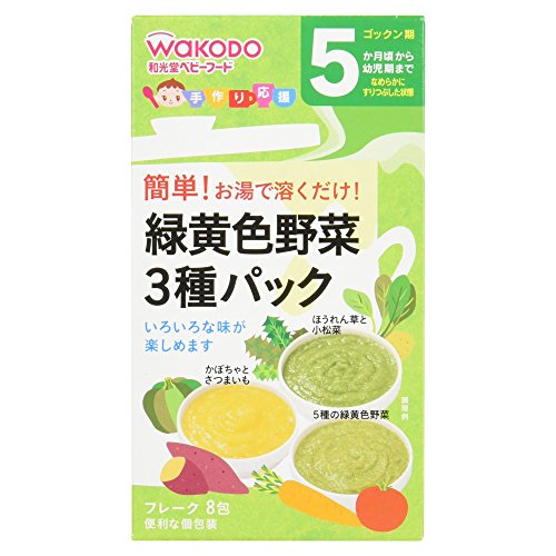 ●【商品説明】●「手作り応援 緑黄色野菜 3種パック 8包 5ヶ月頃から」は、離乳作りに便利ないろいろな野菜を使用したペースト(ベビーフード)の詰合せです。●「ほうれん草と小松菜」「かぼちゃとさつまいも」「5種の緑黄色野菜」の3種類が入っています。●お湯で溶くだけでなめらかなペーストが作れます。●おかゆに混ぜたり、お魚にかけたりと、いろいろなメニュー作りにお使いください。●便利な個包装タイプ。●5ヶ月頃から幼児期まで。●なめらかにすりつぶした状態。●【原材料に含まれるアレルギー物質】●小麦●【つくり方】●ひとさじからはじめよう離乳開始時からお使いいただけます。●最初は1-2さじから始め、慣れたら量・回数を次第に増やせます。●つくり方本品1包に対し、お湯約15ml(大さじ1杯)を加えて溶かします。●食べやすい温度か確認してからあげてください。●(大さじは15mlの計量スプーンです。●)●【ご注意】●※着色料、保存料、香料は使用しておりません。●※デキストリンとは、でんぷんを消化吸収しやすいように分解したものです。●お湯の取り扱いにご注意ください。...
